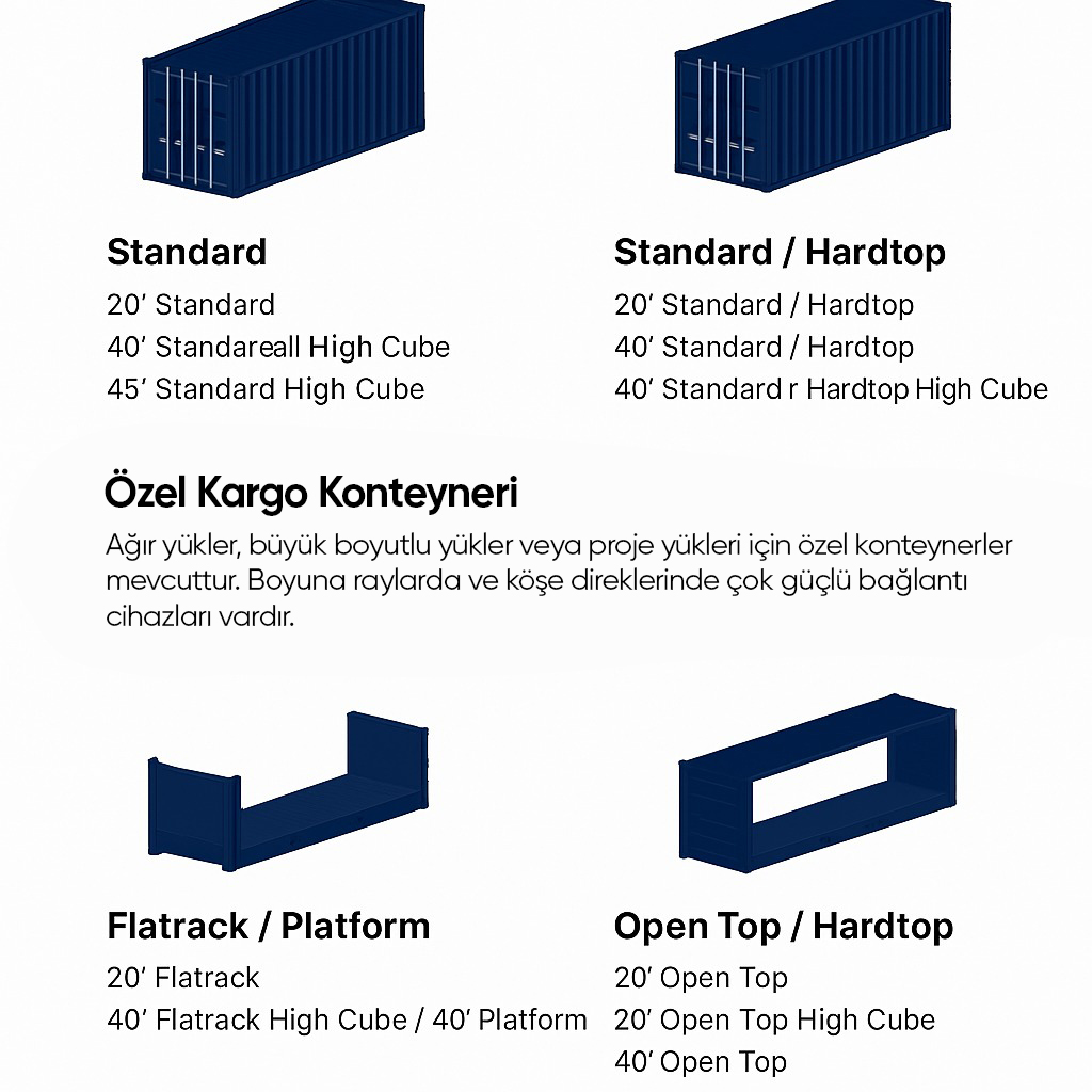 Lütfen dikkat: Burada verilen teknik özellikler, yalnızca Intransia konteyner filosundaki konteynerler için örnek teşkil etmekte olup, konteynerler üreticilerine göre farklılık gösterebilir. Gönderiniz için özel ekipman gereksinimleriniz olması durumunda, lütfen müşteri hizmetleri temsilcilerimizden biriyle iletişime geçmenizi rica ederiz.